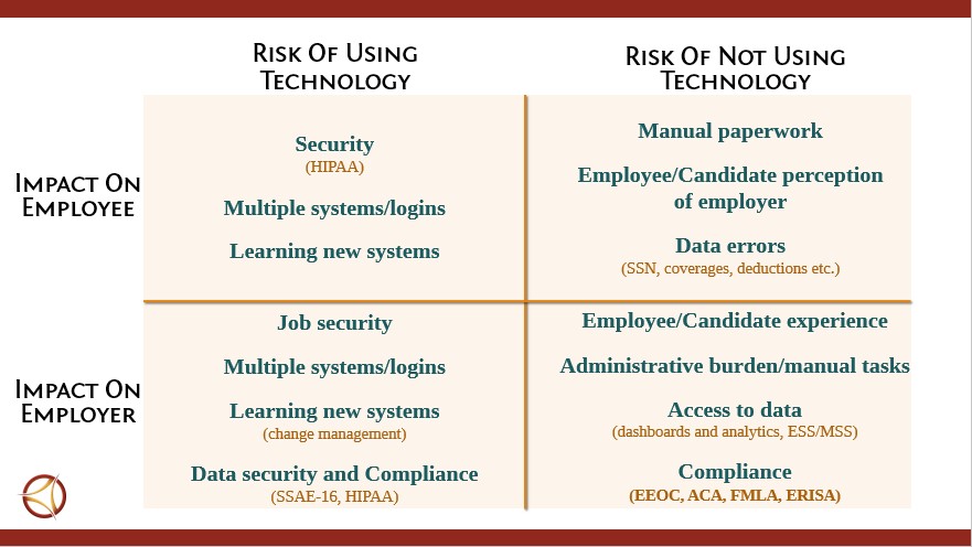 With any new technology, it’s important to make sure it’s doing what it’s designed to do for your company. Based on his experience, Michael Nader, Partner with Faegre Baker Daniels, LLP, identified seven employee benefit areas that can either be a sword to defend or impale your company: Electronic Distribution of SPD’s and notices, ePHI, electronic messaging, ACA reporting, E-records, litigation, and E-payments. If the technology that supports these areas is not working as designed, it will cause issues for your HR department and diminish the employee experience. On the other hand, without technology, the HR experience can create an increased margin for error and a negative employee experience with archaic practices and paperwork. The graph below shows the technology risk and impact on employees and employers.